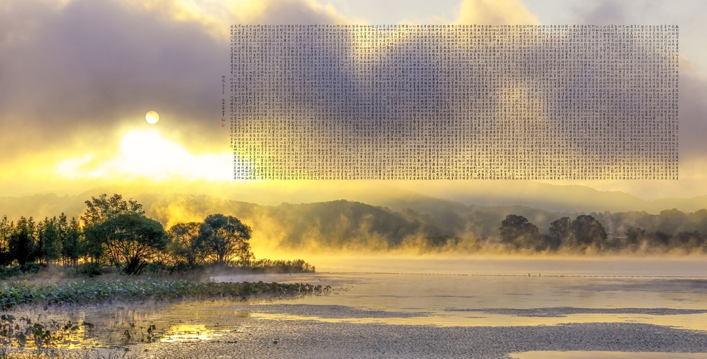 그의 전시 작품 일부에는 서예가 고(故) 정채창 선생이 생전 정교하게 세필한 반야심경이나 화엄경 약찬게, 금강경 경구 등이 편집 작업을 통해 함께 실렸다. 안개 낀 새벽 양수리 풍경과 연꽃잎 위로 또렷하게 드러난 불경 글귀를 감상할 수 있다.