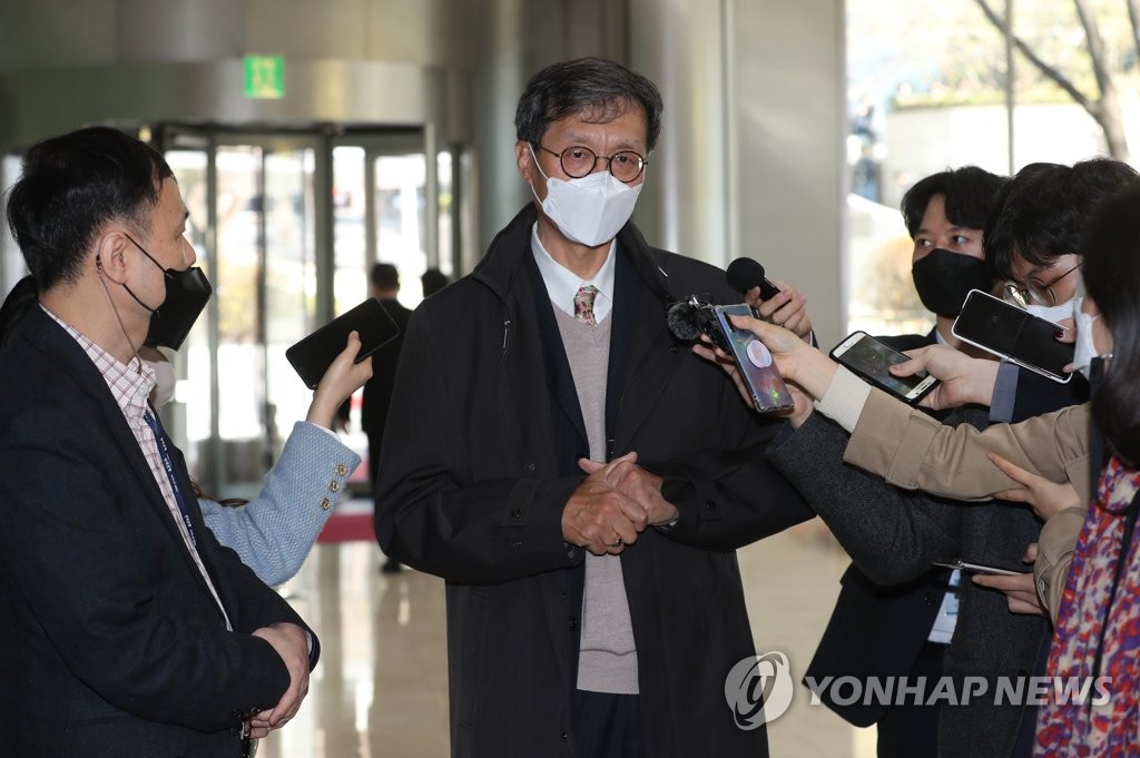 | ▲ Rhee Chang-yong, the nominee for the governor of the Bank of Korea, answers reporters' questions while reporting to work at his office in Seoul on April 1, 2022, to prepare for his parliamentary confirmation hearing. (Pool photo) (Yonhap) |