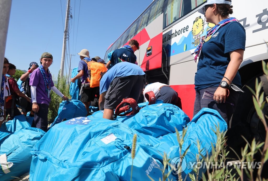 | ▲ 버스에 실리는 스카우트 짐 (부안=연합뉴스) 나보배 기자 = 8일 오전 전북 부안군 새만금 세계스카우트 잼버리 야영지에서 각국 스카우트 대원들이 버스에 짐을 싣고 있다. 2023.8.8 warm@yna.co.kr |