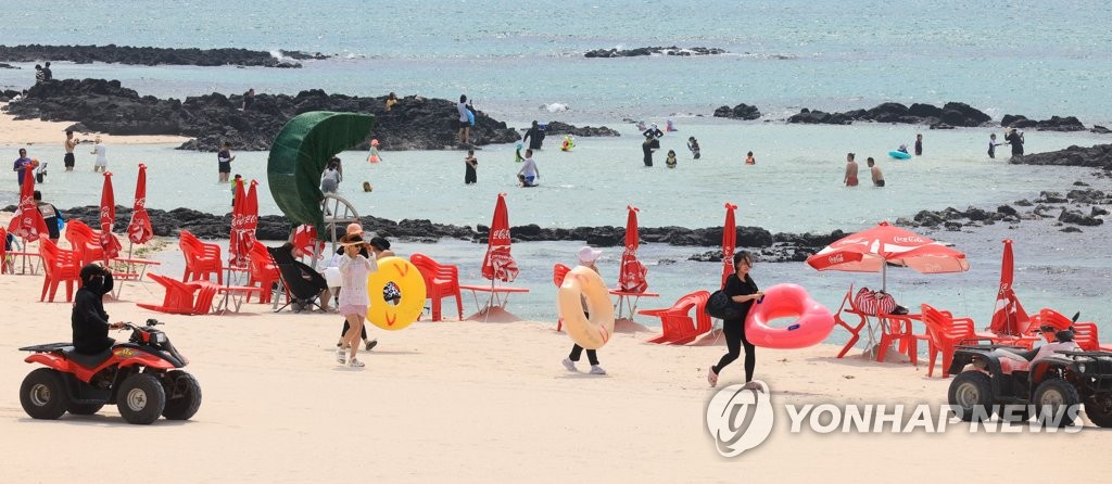 | ▲ '벌써 이렇게 덥다니' (제주=연합뉴스) 폭염이 몰아친 지난 10일 오후 제주시 애월읍 곽지해수욕장을 찾은 피서객이 물놀이를 하고 있다. [연합뉴스 자료사진] |