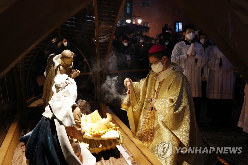 | ▲ 명동성당, 구유 예절의식 (서울=연합뉴스) 박동주 기자 = 천주교 서울대교구장 정순택 대주교가 24일 서울 명동성당 앞마당에서 아기 예수를 말구유에 안치하는 구유 예절의식을 하고 있다. 2022.12.25 pdj6635@yna.co.kr |