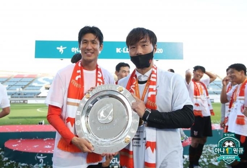| ▲ 남기일 제주 감독(오른쪽)과 함께 K리그2 2020 우승 트로피를 든 정조국. [한국프로축구연맹 제공. 재판매 및 DB 금지] |