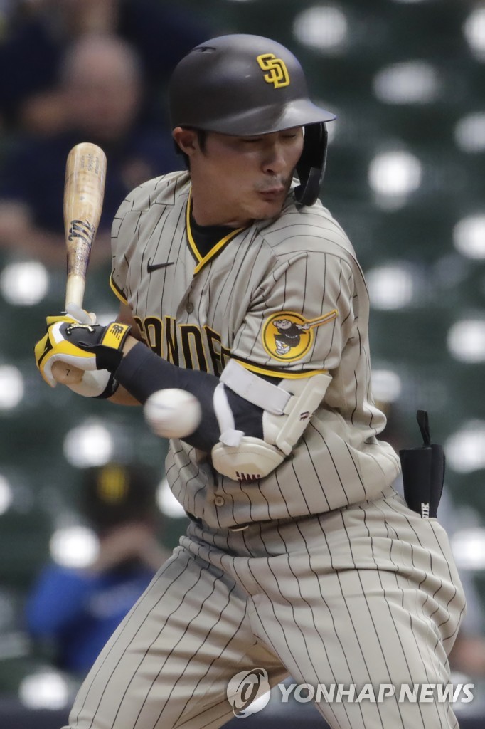 | ▲ 사구로 출루하는 김하성 (밀워키 AP=연합뉴스) 샌디에이고 파드리스 3루수 김하성이 26일(한국시간) 미국 위스콘신주 밀워키 아메리칸패밀리필드에서 열린 밀워키 브루어스와의 방문 경기 3회초, 상대 선발 코빈 번스의 공에 왼쪽 팔꿈치를 맞고 있다. |