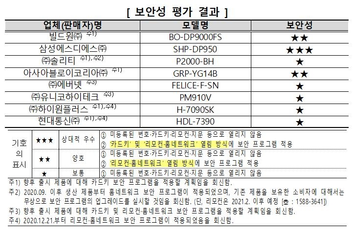 빌드원과 아사아블로이코리아는 리모컨·홈네트워크 방식에 보안 프로그램을 적용해 '양호' 평가를 받았다. 이들 업체는 향후 출시 제품부터 카드키에도 보안 프로그램을 적용할 계획이다.