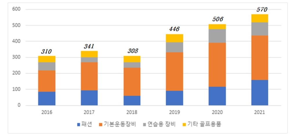 골프용품은 패션용품, 기본 운동장비, 연습용 장비로 구분된다.