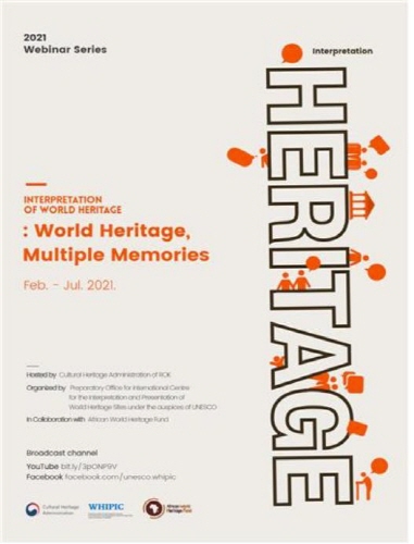 문화재청(청장 김현모)은 2월부터 7월까지 6개월간 매월 '세계유산 해석 웨비나: 하나의 유산, 서로 다른 기억' 웨비나(webinar)를 유네스코 세계유산국제해석설명센터 설립추진단(이하 국제센터 설립추진단)과 함께 온라인으로 개최한다.