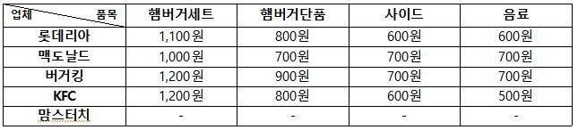 | ▲ 햄버거 프랜차이즈의 품목별 배달 가격과 매장 가격 차이 [한국소비자원 제공. 재판매 및 DB 금지] |