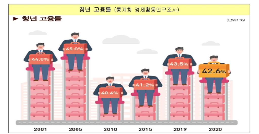 복지부는 "청년 고용률은 2010년대 이후 계속 증가세를 보이며 2019년에는 43.5%에 달했으나 2020년에는 42.6%로 전년 대비 0.9%포인트(P) 감소했다"고 설명했다.