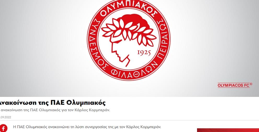 | ▲ 코르베란 감독과 동행이 끝났다고 밝힌 올림피아코스 [올림피아코스 홈페이지 캡처. 재판매 및 DB 금지] |