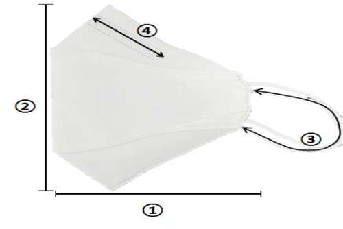 | ▲ 마스크 세부 수치 사진 ① 가로길이 ② 세로길이 ③ 귀끈 길이 ④ 코편(코지지대) 길이 [소비자원 제공, 재판매 및 DB금지] |