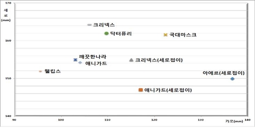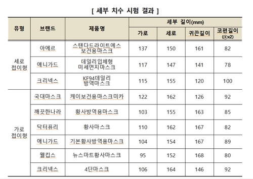 조사 결과 같은 대형이라도 제품에 따라 가로길이(마스크를 반으로 접은 상태에서 측정한 최대 수평길이)가 최대 42mm, 세로길이는 최대 17mm 차이가 났다.
