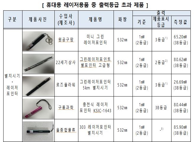 문제 제품 5개 모두 레이저빔을 인체에 짧게 노출해도 눈과 피부에 심각한 상해를 가할 수 있는 3B등급으로 분류됐다.