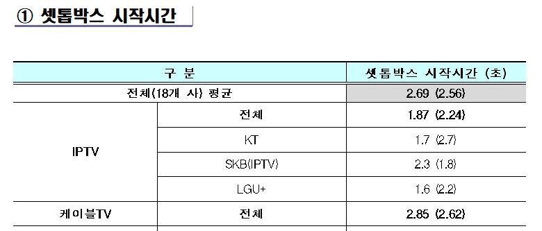 셋톱박스 시작 시간은 IPTV 1.87초, MSO 3.45초로 전년 대비 각각 0.37초, 0.14초 줄었다. 그러나 중소SO는 2.52초,위성방송은 2.84초로, 전년보다 각각 0.44초, 0.11초 길어졌다.