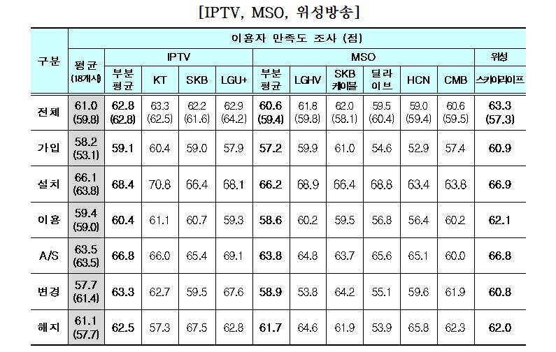 매체별로는 IPTV의 만족도가 62.8점, MSO 60.6점, 중소SO 60.3점, 위성방송 63.3점이었다.