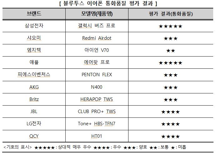 그 결과 통화 품질은 삼성전자의 '갤럭시 버즈 프로'와 애플의 '에어팟 프로'가 매우 우수하다고 평가받았다.