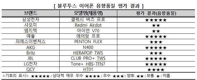 | ▲ 블루투스 이어폰 음향품질 평가 결과 [한국소비자원 제공. 재판매 및 DB 금지] |