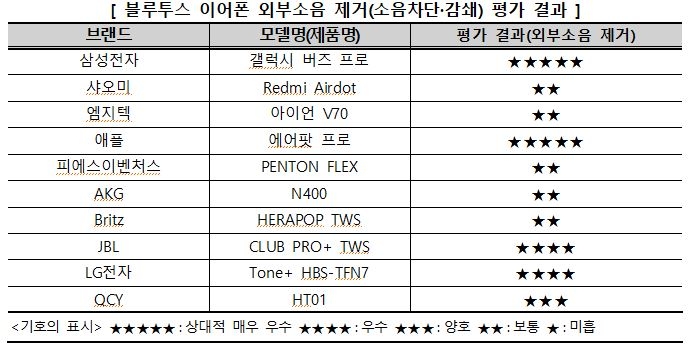 | ▲ 블루투스 이어폰 외부소음 제거기능 평가 결과 [한국소비자원 제공. 재판매 및 DB 금지] |