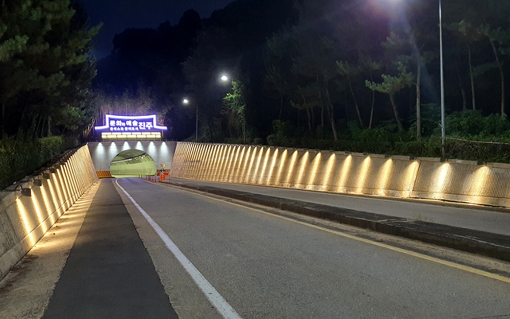 서진주IC 터널 상부에는 촉석루 이미지의 사인물과 측면 경관등 점등으로 역사의 도시 진주에 들어섰음을 확연히 느낄 수 있도록 한다.