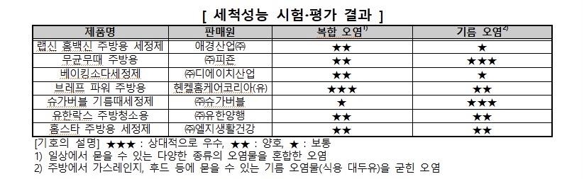 평가대상은 소비자 설문조사로 선정한 애경산업 랩신 홈백신 주방용 세정제, 피죤 무균무때 주방용, 디에이치산업 베이킹소다 세정제, 헨켈홈케어코리아 브레프 파워 주방용, 슈가버블 기름때 세정제, 유한양행 유한락스 주방 청소용, 엘지생활건강 홈스타 주방용 세정제 등 7개 제품이다.