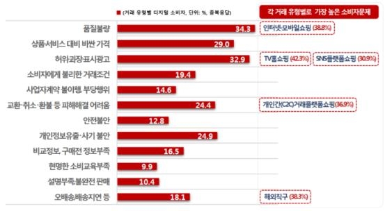허위·과장 광고 등과 관련한 불만은 TV홈쇼핑(42.3%)과 SNS 플랫폼(30.9%)에서 가장 많았다. 개인 간 거래 플랫폼은 교환·취소·환불 등 피해 해결이 어렵다는 불만(36.9%)이 많았고, 해외 직구는 오배송이나 배송 지연(38.3%) 등의 문제가 두드러졌다.
