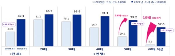 2019년 조사 때 50대의 디지털 소비 이용률은 29.5%였지만 이번 조사에서는 79.2%로 2.6배 뛰었고, 60대 이상의 경우 같은 기간 5.6%에서 57.6%로 10배 이상 늘었다.