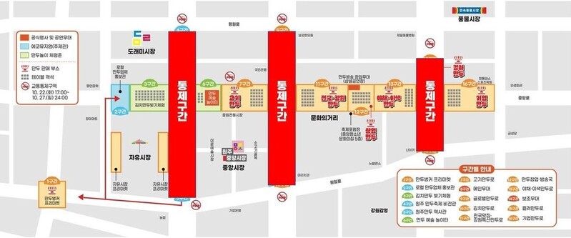 교통 통제 구간에는 만두왕 빅쇼, 개·폐막식, 김치만두 경연대회 등이 펼쳐지는 메인·보조무대와 10대 테마로 100가지 이상의 만두를 판매하는 만두 판매 부스 50여개가 들어선다.