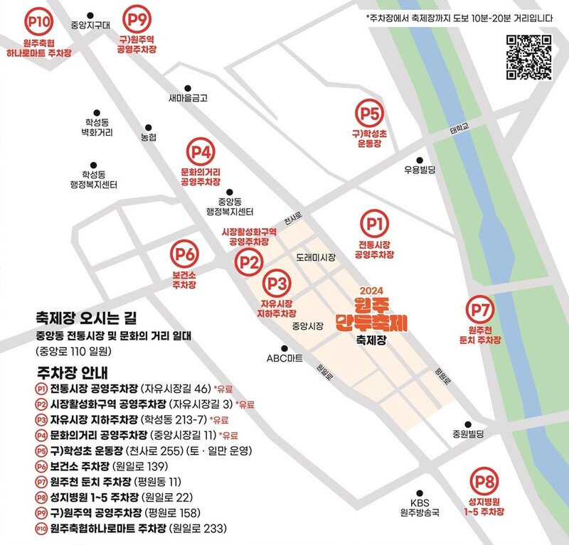 축제 방문객의 접근 편의를 위해 전통시장 공영주차장, 시장 활성화 구역 주차장, 자유시장 지하 주차장 등 임시 주차장 10곳을 운영한다.