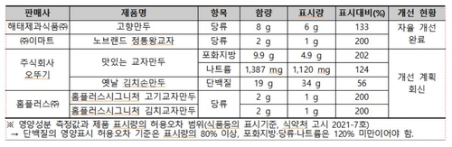 오뚜기[007310]의 '맛있는 교자만두'는 포화지방이 4.9g 들어있다고 표시했지만 실제 함유량은 9.9g였고, 같은 회사의 '옛날 김치손만두'는 단백질 함량을 34g으로 표시했지만 실제 함유량은 19g에 그쳤다.