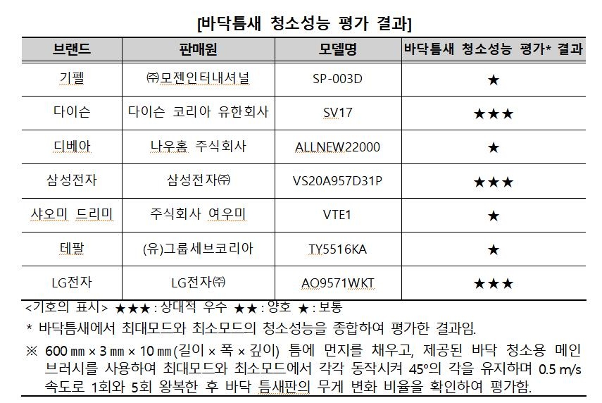 | ▲ 바닥틈새 청소성능 평가 결과 [한국소비자원 제공. 재판매 및 DB 금지] |