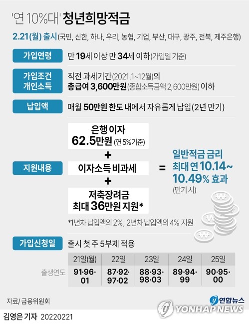 | ▲ [그래픽] '연 10%대' 청년희망적금 (서울=연합뉴스) 김영은 기자 = 최고 연 10% 안팎의 금리 효과를 내는 '청년희망적금'이 출시 전 가입 가능 여부 조회에 200만명이 몰리는 높은 관심 속에 21일 출시된다. 0eun@yna.co.kr 트위터 @yonhap_graphics 페이스북 tuney.kr/LeYN1 |