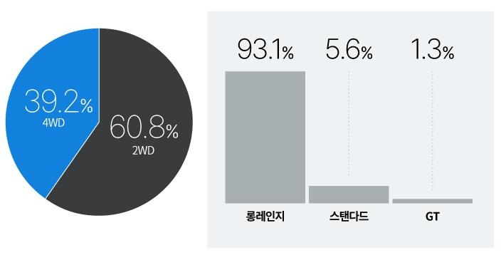 또 동승석 파워시트, 앞좌석 릴렉션 컴포트시트, 동승석 워크인 디바이스 등을 포함한 '컴포트' 패키지 선택 비율도 88.4%에 달했다.