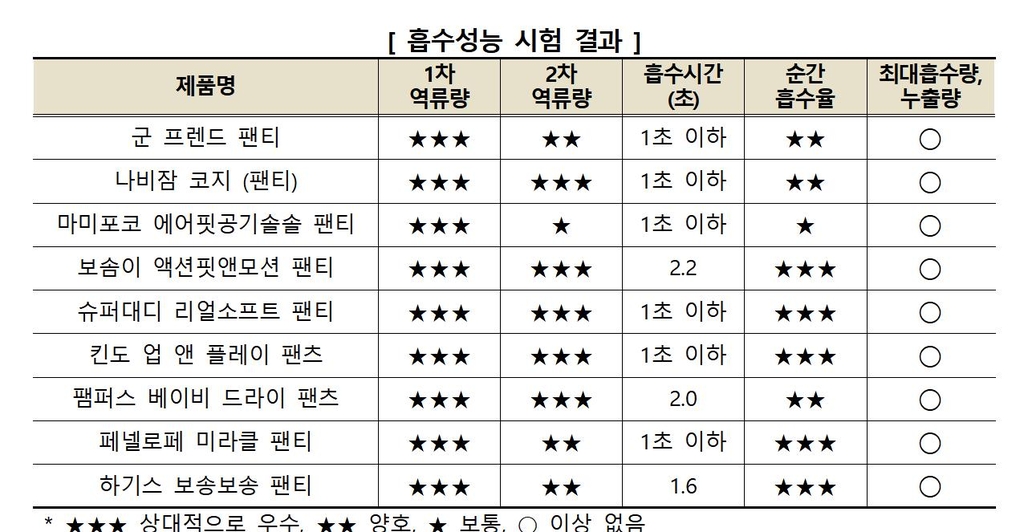 "일회용 기저귀 흡수성능, 슈퍼대디·킨도 제품 등 상대적 우수"