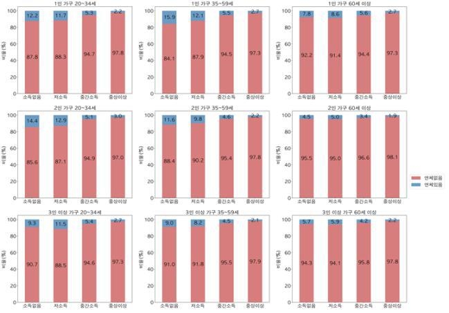 그 뒤로 소득이 없는 청년층(20∼34세) 2인 가구(14.4%)와 저소득(소득 3천만원 이하) 청년층 2인 가구(12.9%), 소득이 없는 청년층 1인 가구(12.2%) 순으로 요금 연체 경험률이 높게 나타났다.