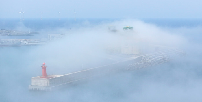 Sea fog blankets the surface of the sea off a port in the city of Jeju on South Korea's largest island of the same name on May 13, 2025. (Yonhap)