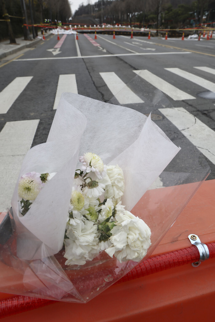 Flowers are laid at the site of a sinkhole, 20 meters wide and 18 meters deep, at an intersection in Seoul's Gangdong Ward on March 28, 2025, to pay tribute to a motorcyclist who fell into the sinkhole on March 24. (Yonhap)