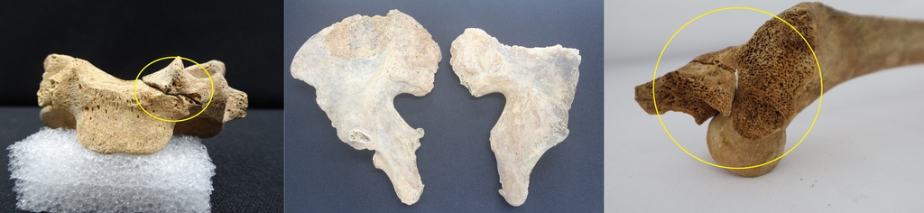 | ▲ 복자 윤지충·권상연·윤지헌 유해 (전주=연합뉴스) 전북 완주군 초남이성지에서 발견된 순교자 윤지충(왼쪽부터)·권상연·윤지헌의 유해. 윤지충·윤지헌 유해에서는 날카로운 도구로 절단한 것으로 추정되는 '예기손상'이 발견됐다. 천주교 전주교구 측은 이를 두고 "참수형과 능지처사의 확실한 증거"라고 지적했다. 2021.9.1 [천주교 전주교구제공. 재배포 및 DB금지] (끝) |