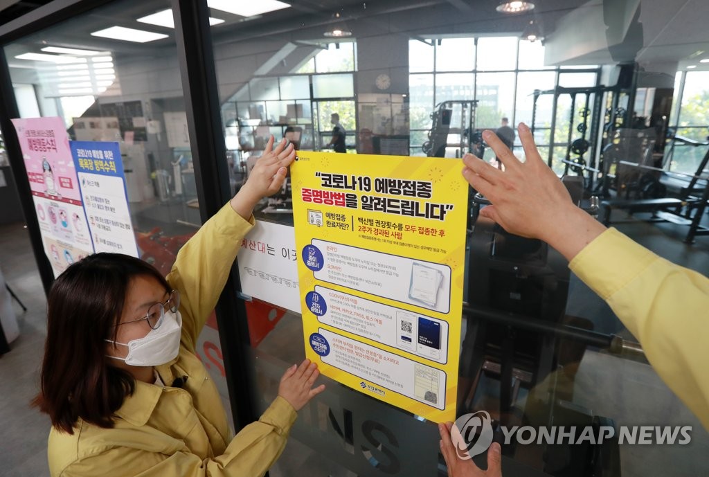 | ▲ 헬스장 출입시 백신 필수 (부산=연합뉴스) 손형주 기자 = 2일 오후 부산진구 한 헬스장에서 부산진구청 관계자들이 방역패스'(백신패스, 접종증명·음성확인제) 안내문을 부착하고 있다. 2021.11.2 handbrother@yna.co.kr |