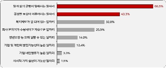경총에 따르면 괜찮은 일자리의 판단기준을 묻는 말에 응답자의 66.5%(복수응답)가 '일과 삶의 균형이 맞춰지는 일자리'라고 답했다. 이어 '공정한 보상이 이뤄지는 일자리'(43.3%), '복지제도가 잘 된 일자리'(32.8%), '회사 분위기가 수평적이고 자유로운 일자리'(25.9%) 등의 순이었다.