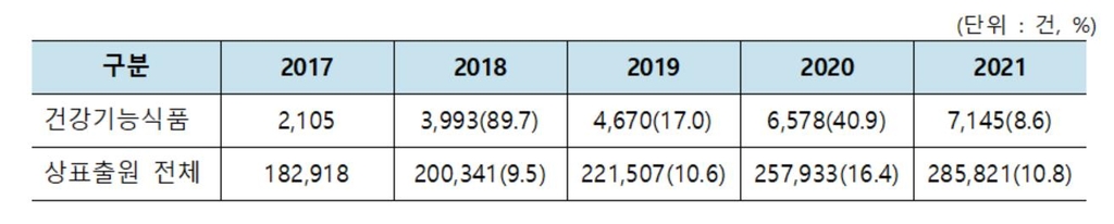 3일 특허청에 따르면 건강기능식품 상표출원은 2017년 2천105건에서 지난해 7천145건으로, 5년간 239% 증가했다.