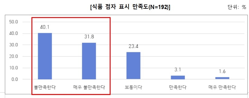 식품 점자 표시에 대한 만족도는 71.9%가 불만족(40.1%)하거나 매우 불만족(31.8%)한다고 답했다.