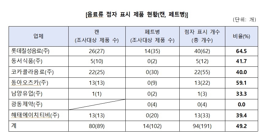 음료는 191개 제품 중 49.2%(94개)에 점자 표시가 있었다. 세부적으로 보면 캔 음료는 89개 중 89.9%에, 페트병은 102개 중 13.7%에 점자 표시가 있어 용기 재질에 따라 점자 표시율의 차이가 큰 것으로 조사됐다.