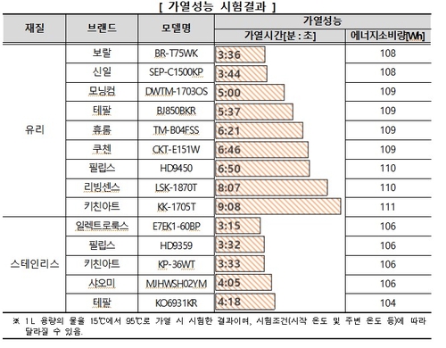 유리 재질은 보랄(모델명 BR-T75WK), 신일(SEP-C1500KP) 등 2개 제품이, 스테인리스 재질은 일렉트로룩스(E7EK1-60BP), 키친아트(KP-36WT), 필립스(HD9359) 등 3개 제품의 가열시간이 3분대로 짧았다.