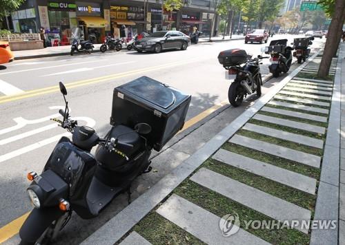 | ▲ Motorbikes for food delivery are parked along a street in Seoul on Nov. 1, 2021. (Yonhap) |
