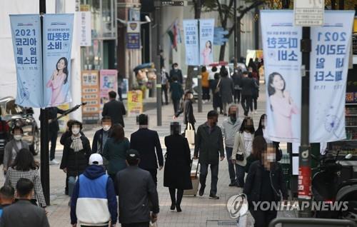 | ▲ People walk past signs promoting the 2021 Korea Sale FESTA in the shopping district of Myeongdong in Seoul on Nov. 1, 2021, the first day of the 15-day event to attract foreign tourists and boost domestic consumption. (Yonhap) |