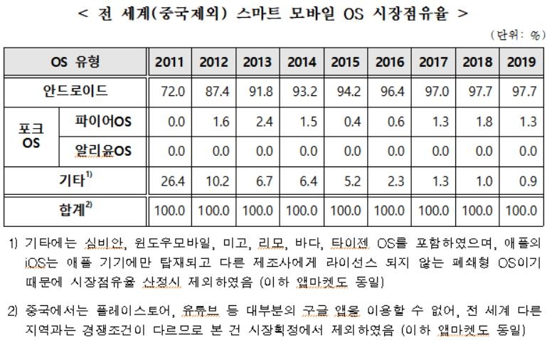 공정위에 따르면, 구글은 안드로이드 OS로 모바일 시장에서 점유율 72%로 지배력을 확보한 이후인 2011년부터 현재까지 제조사에 안드로이드를 변형한 '포크 OS'를 탑재한 기기를 만들지 못하도록 막았다.