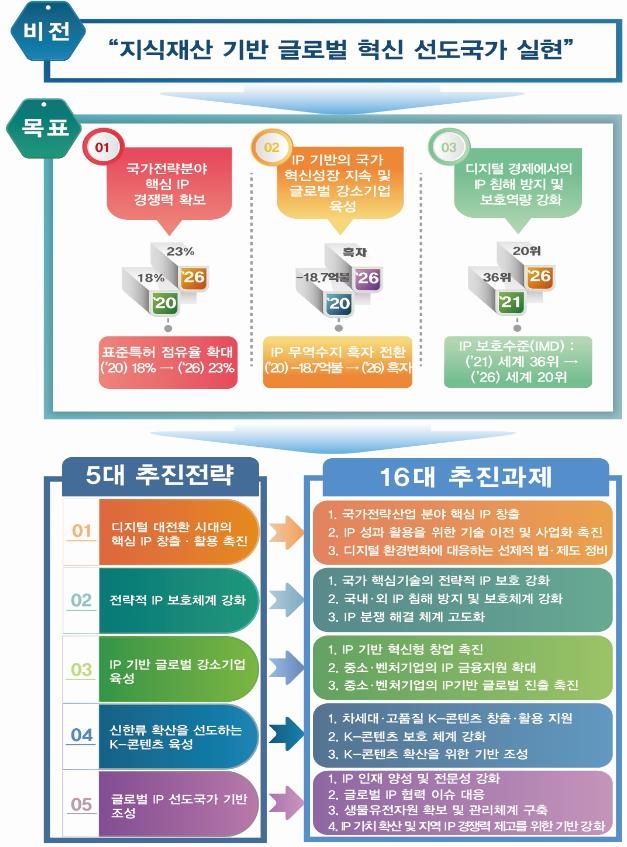 제3차 국가지식재산 기본 계획에 따르면 정부는 디지털 대전환 시대의 핵심 IP 창출을 촉진하기 위해 시스템반도체, 바이오헬스, 미래차 등 국가전략산업 분야의 핵심 IP 확보 전략을 도출할 예정이다.