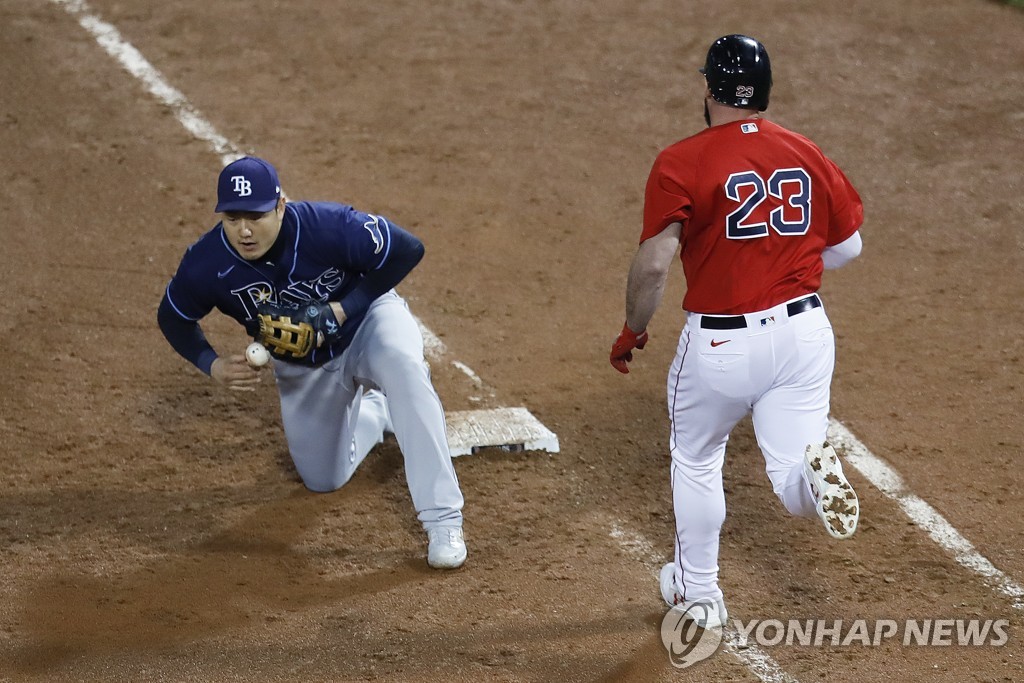 대타 트래비스 쇼의 땅볼 타구를 잡은 탬파베이 3루수 얀디 디아스의 1루 송구가 짧았다. 한 번 튄 공은 1루수 최지만의 미트가 아닌 가슴을 맞고 떨어졌다.