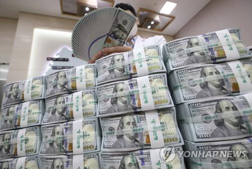| ▲ This file photo taken Sept. 3, 2020, shows a bank official inspecting U.S. dollars before their release at a Seoul branch of Hana Bank. (Yonhap) |