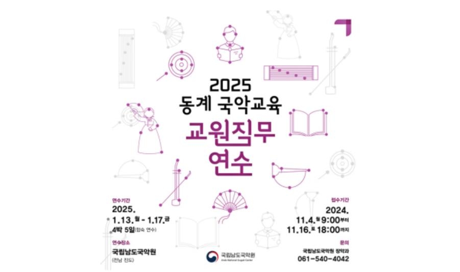(진도=연합뉴스) 조근영 기자 = 국립남도국악원이 '2025 동계 국악교육 교원직무연수'에 참여할 교원 40명을 11월 4∼16일 모집한다.