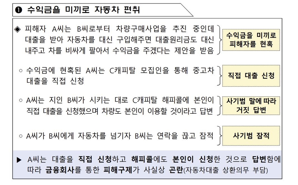 30일 금감원에 따르면 피해자 A씨는 지인 B씨로부터 차량구매사업을 추진 중인데 대출받아 자동차를 대신 사주면 대출 원리금도 대신 내주고 차를 비싸게 팔아 수익금을 주겠다는 제안을 받았다.